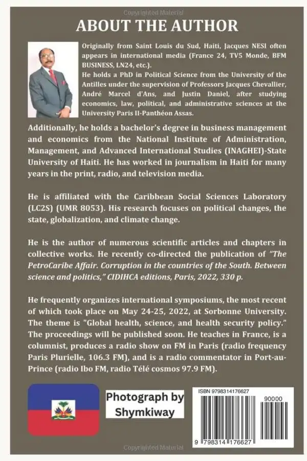 Jacques NESI, is from Saint Louis du Sud, and holds a doctorate in political science from the University of the West Indies under the supervision of Professors Jacques Chevallier, André Marcel d'Ans, and Justin Daniel, after having studied economics, law, political science and administration at the University of Paris II-Panthéon Assas.In addition, he holds a Bachelor's degree in Business Management and Economics from the National Institute of Administration, Management and Advanced International Studies (INAGHEI)-State University of Haïti. He worked in Haiti for many years as a journalist in the print, broadcast, and television press. It is attached to the Caribbean Laboratory of Social Sciences (LC2S) (UMR 8053). He researches political change, the state, globalization, and climate change. He is the author of numerous scientific articles and chapters in collective works. He has just co-edited the publication of " The PetroCaribe Affair. Corruption in the Global South. Between Science and Politics ", CIDIHCA Editions, Paris, 2022.330p. It has also just organized an interdisciplinary and international conference on May 24 and 25, 2022 at Sorbonne University. The theme: "Global Health, Science and Health Security Policy". As an international consultant, he is a frequent contributor to France 24 and other international media. He teaches in France, is an editorialist, producer of a radio show on the FM band in Paris (radio frequency Paris Plurielle, 106.3 FM) and radio columnist in Port-au-Prince (radio Télé cosmos 97.9 FM).